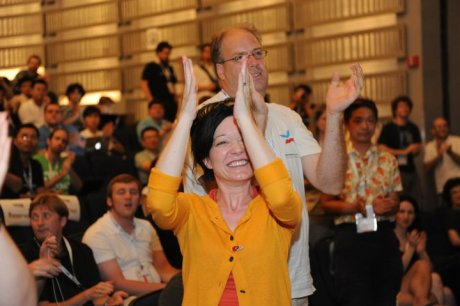 Jan-Bart de Vreede and Sue Gardner at the Wikimania Haifa finale (9 August 2011)
